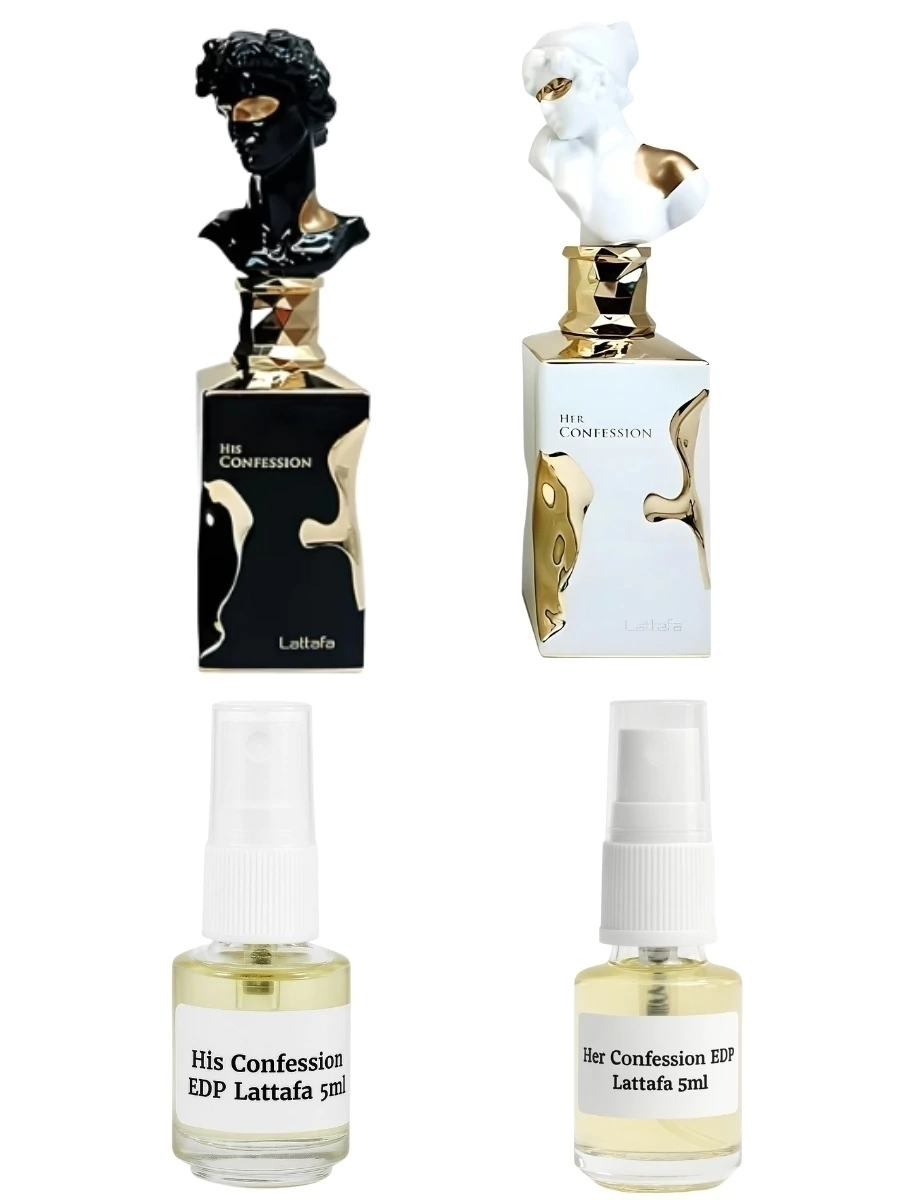 His Confession de Lattafa Perfumes é um perfume Oriental Amadeirado Masculino. Esta é uma nova fragrância. His Confession foi lançada em 2024. As notas de topo são: Canela, Lavanda e Mandarina. As notas de coração são: Íris, Benjoim, Cipreste e Mahonial®. As notas de fundo são: Baunilha, Fava Tonka, Âmbar, Incenso, Cedro e Patchouli.