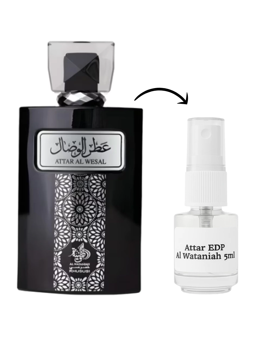 Attar Al Wesal de Al Wataniah é um perfume Oriental Especiado Compartilhável. Attar Al Wesal foi lançada em 2020. As notas de topo são: Lavanda, Pera, Hortelã, Bergamota e Limão. As notas de coração são: Canela, Sálvia Esclaréia e Cominho. As notas de fundo são: Casca de Baunilha Negra, Cedro, Âmbar e Patchouli.